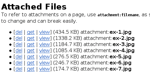 Pour faire référence à une pièce jointe de la page, utilisez attachment:nomdefichier.ext ; un lien de ce type suit toutes les règles applicables aux liens normaux (c'est-à-dire que les images sont automatiquement affichées dans la page). N'utilisez pas l'URL du lien [obtenir] présent sur la page d'envoi des pièces jointes, car ces liens peuvent changer et pourraient ne plus être valides après une mise à jour des paramètres du wiki. Pour faire référence à des pièces jointes à d'autres pages, utilisez attachment:NomWiki/nomdefichier.ext.
